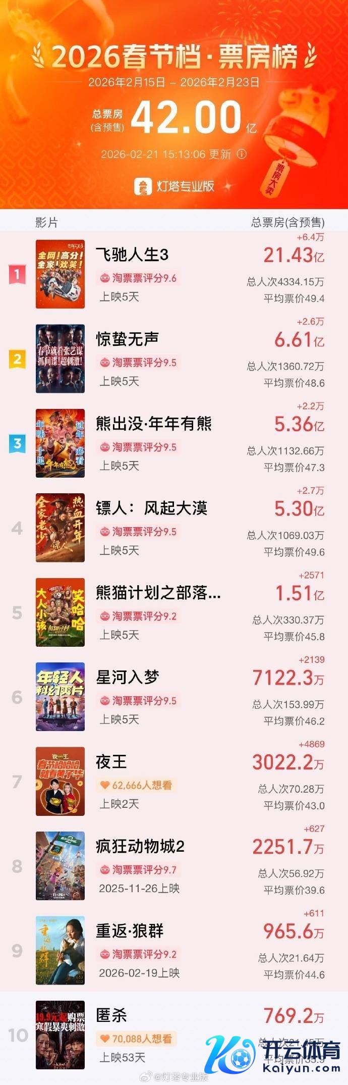 IT之家从灯塔专科版获悉,胁制 2 月 21 日 15 时 13 分,2026 春节档(2 月 15 日-2 月 23 日)档期总票房(含预售)打破 42 亿。