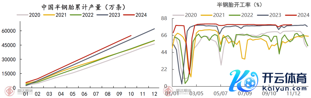 顺丁橡胶卑鄙约70%是旁边于轮胎,而其中45%是旁边于半钢胎,25%旁边于全钢胎。本年1-10月受新动力汽车增长带动乘用车产量累计同比加多3%,重迭出口增长身分影响,本年1-10月,我国半钢轮胎产量5.5亿条,累计同比加多7.8%,半钢胎开工位于季节性高位。半钢阛阓的高景气度对顺丁橡胶需求具有较强启动。