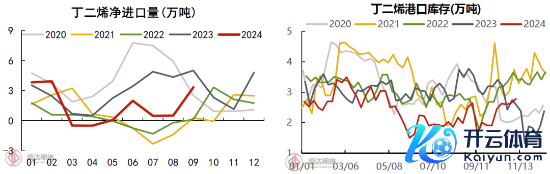 本年上半年以来,国内丁二烯现货畅达资源偏紧,开阔月份净入口不及1万吨,而9月净入口环比大幅擢升至3.4万吨,据阛阓了解,10月和11月国内入口到港斟酌均处于高位,同期,从国内丁二烯口岸库存不错看出,自10月初以来,丁二烯口岸库存从1.91万吨累至2.65万吨,入供词应角落宽松。
