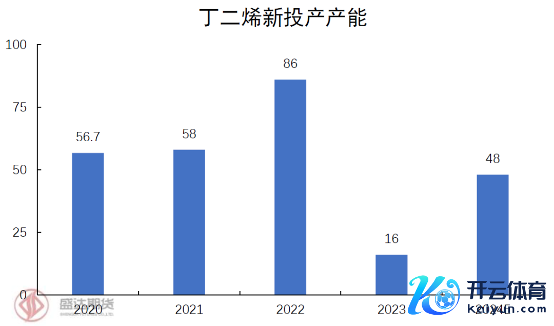 2023年至2024年上半年,国内丁二烯新增产能均较少,2023年新增产能仅16万吨,远低于往年水平。而本年下半年迎来4套新安装投产,其中11月,中石化英力士(天津)石化有限公司17万吨/年丁二烯安装奏凯投产,山东裕龙石化裂解安装络续11月底开车,2024年共新增产能约48万吨,较2023年高涨3倍,国产量存在角落加多,此外,产能加多导致阛阓产生看跌心态,上游积极排库,加重丁二烯价钱的快速回落。