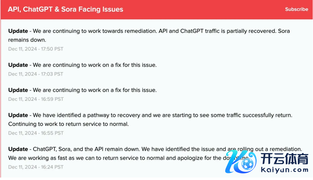 北京时间12月12日,OpenAI暗示,API、ChatGPT和Sora流量已基本复原。“咱们正在监测场面,以确保全面管制宕机事故。”