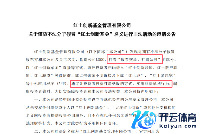 红土立异基金12月7日公告则走漏,违规分子假冒激动方和公司及职工口头,伪造公司LOGO,打着“股票调换、打造妖股”的旗子、以“红土立异军团”直播等形式,辅导投资者扫码过问“红土立异定约、红土散户定约、红土定约”等微信群或点击着手不解集中及下载“红地皮”“红土梦念念家”等手机利用设施(APP),通过让投资者投资打造妖股的形式,现实罪人营利步履,骗取投资者财帛。