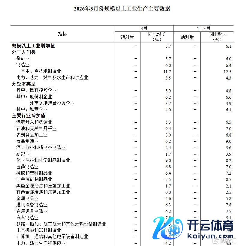 分行业看,3月份,41个大类行业中有30个行业加多值保合手同比增长。其中,煤炭开采和洗选业增长5.3%,石油和自然气开采业增长9.4%,农副食物加工业增长8.0%,酒、饮料和精制茶制造业增长2.4%,纺织业增长1.7%,化学原料和化学成品制造业增长9.0%,非金属矿物成品业下落5.5%,玄色金属冶真金不怕火和压延加工业增长1.7%,有色金属冶真金不怕火和压延加工业同比合手平,通用斥地制造业增长6.3%,专用斥地制造业增长6.2%,汽车制造业增长7.5%,铁路、船舶、航空航天和其他运载斥地制造业增长13.3%,电气机械和器材制造业增长5.4%,策动机、通讯和其他电子斥地制造业增长12.5%,电力、热力分娩和供应业增长4.2%。
