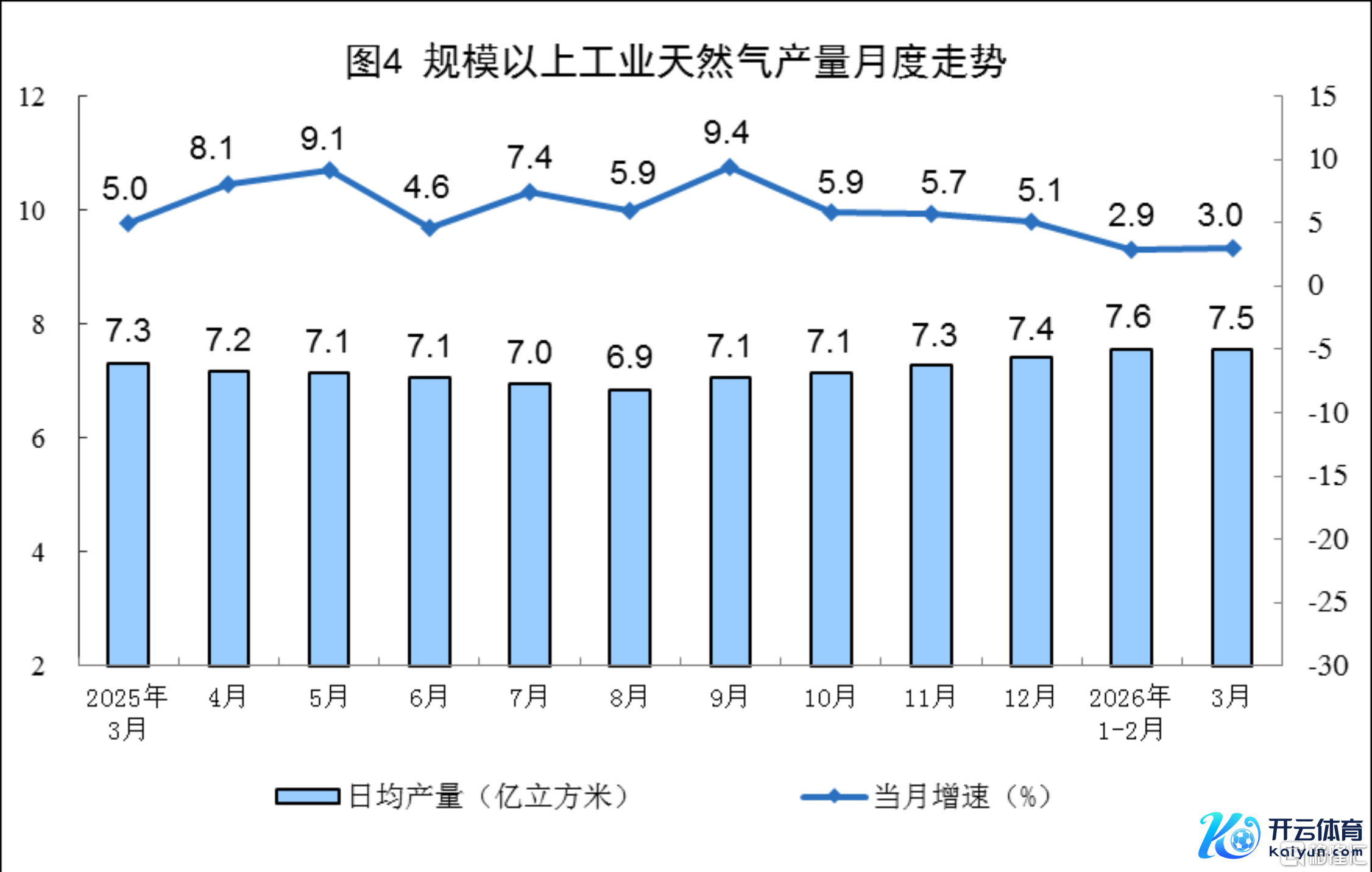 自然气分娩增速加速。3月份,规上工业自然气产量234亿立方米,同比增长3.0%,增速比1—2月份加速0.1个百分点;日均产量7.5亿立方米。