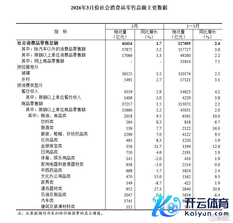 按破钞类型分,3月份,商品零卖额37257亿元,同比增长1.5%;餐饮收入4359亿元,增长2.9%。1—3月份,商品零卖额113072亿元,同比增长2.2%;餐饮收入14623亿元,增长4.2%。